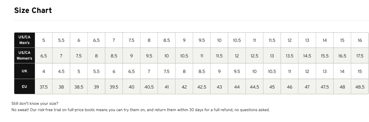 - If we don’t have your half-size, we recommend you size up. If you prefer a more relaxed fit, or have wider feet, we suggest buying your size and then adjusting the width of your boot using the instructions that come in the box.